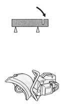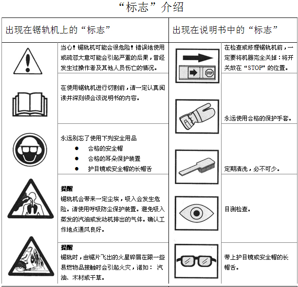 在使用一臺新的鋸軌機前: l 從頭至尾,認真閱讀操作手冊。 l 檢查鋸片的安裝及調(diào)整。詳見“安裝”一章。 l 啟動發(fā)動機并檢查化油器是否調(diào)節(jié)無誤。見“保養(yǎng)”一章中“化油器”一節(jié)在空氣/汽油混合正確的情況下,鋸片的停止應(yīng)該是慢慢減速直到最后靜止。緩慢減速的調(diào)節(jié)在手冊中有說明。對運轉(zhuǎn)狀態(tài)的調(diào)節(jié)應(yīng)按此說明正確調(diào)節(jié)。在緩慢減速狀態(tài)未正確調(diào)好時,請不要使用鋸軌機! l 請讓您的Husqvarna的銷售商來負責必要的機器維修及調(diào)節(jié)。