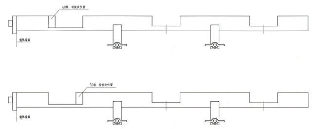 5.2 50kg/m和60kg/m鋼軌使用的是一個定位尺,如圖所示,將轉(zhuǎn)換塊安裝在軌端一側(cè)即為60kg/m鋼軌使用,將轉(zhuǎn)換塊安裝在另一側(cè)即為50kg鋼軌使用。